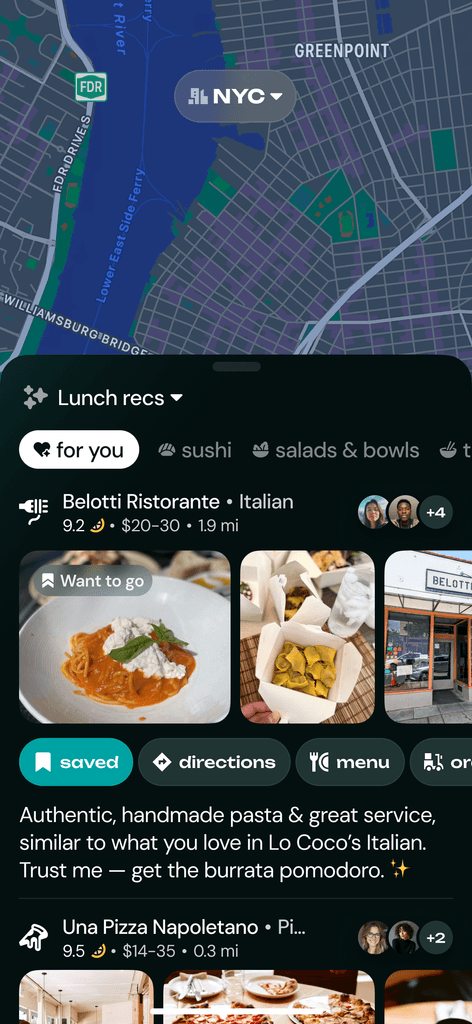 Zest auto-maps everywhere you’ve eaten, recommends spots you’ll love, and surfaces your friends’ favorites around the world.